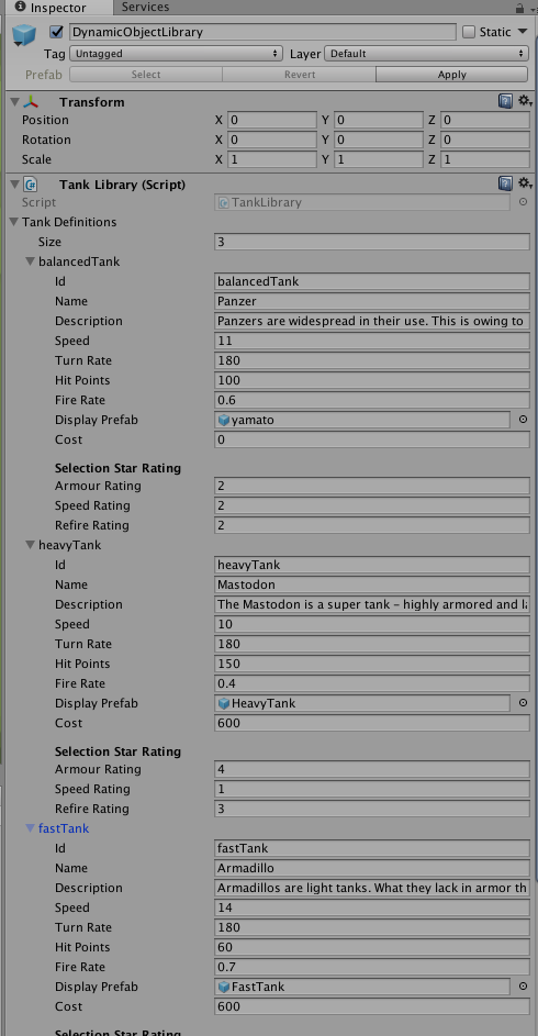 DynamicObjectLibraryの中をInspectorで見るとTankLibraryスクリプトがアタッチされていて、その内容を見てみるとタンクデータの構造体が定義されていて3種類のタンクが登録されています。下記例では最初のタンクにyamatoプレファブを設定していて戦艦大和が登場できるようにしています。