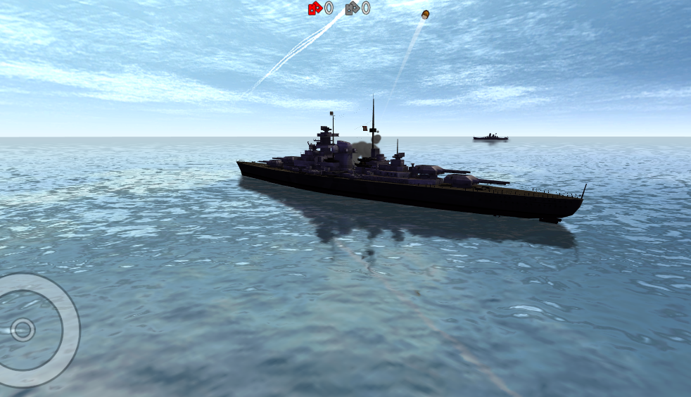 ちょっわかりにくいかも知れませんが、手前が自分のビスマルクです。向こうの小さな船影はネットワーク対戦相手の戦艦大和です。自分のビスマルクがちょうど主砲を1発発射した瞬間の画像です。主砲はまだ船体の中心から1発だけ飛ぶようになっていますが、主砲の方位と仰角の制御はmacのキーボードで制御して発射指示を出して売っています。