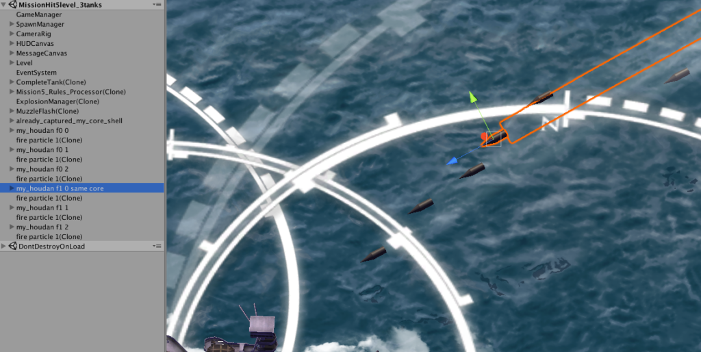 今回は①の方式を取ろうと思って進めましたが、元々存在している戦車(TANK)としての砲弾がコライダーを使っているため、主砲砲弾9発が同時に飛ぶと互いに相互干渉して問題が発生してしまいました。ネットワークとして管理されているのは1発の戦車砲弾だけですので、この戦車砲弾と戦艦砲弾の干渉はうまくありません。